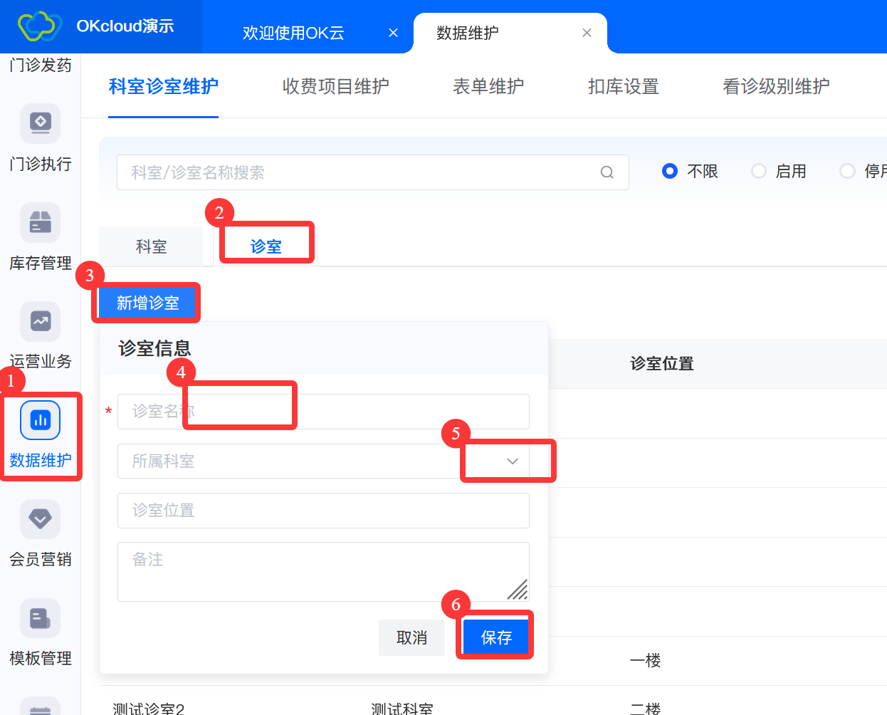 业务介绍对诊所的诊室进行维护,以便开展后续业务,维护过程中请务必保证数据真实及准确性。 诊室维护流程 1.新增诊室-> 2.点击保存 具体操作 1.点击【数据维护】->【科室诊室维护】->【诊室】->【新增诊室】,填写诊室名称,点倒三角下拉选择所属科室,填写诊室位置,点击保存后诊室新增成功。 文档更新时间: 2026-02-26 15:57 作者:刘兰兰