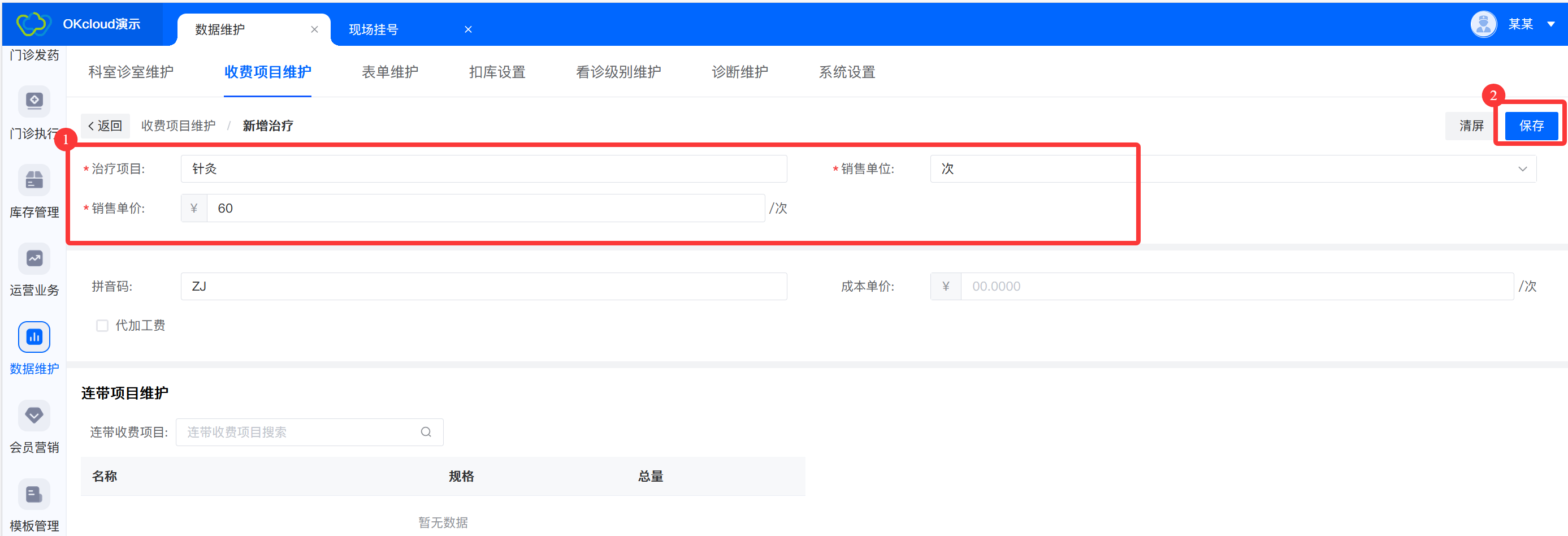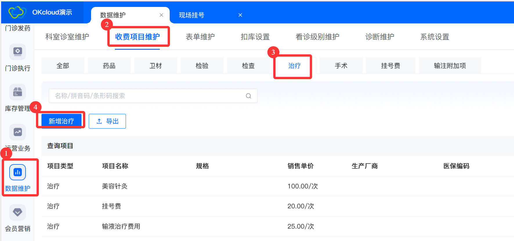 业务介绍对治疗信息进行维护 治疗维护流程 1.新增治疗 -> 2.输入治疗信息-> 3.点击保存 具体操作 1.登录进系统后,点击【数据维护】->【收费项目维护】->【治疗】->【新增治疗】进入治疗信息填写页面。 2.输入治疗项目、销售单位、销售单价,点击保存。 文档更新时间: 2026-02-26 15:58 作者:刘兰兰