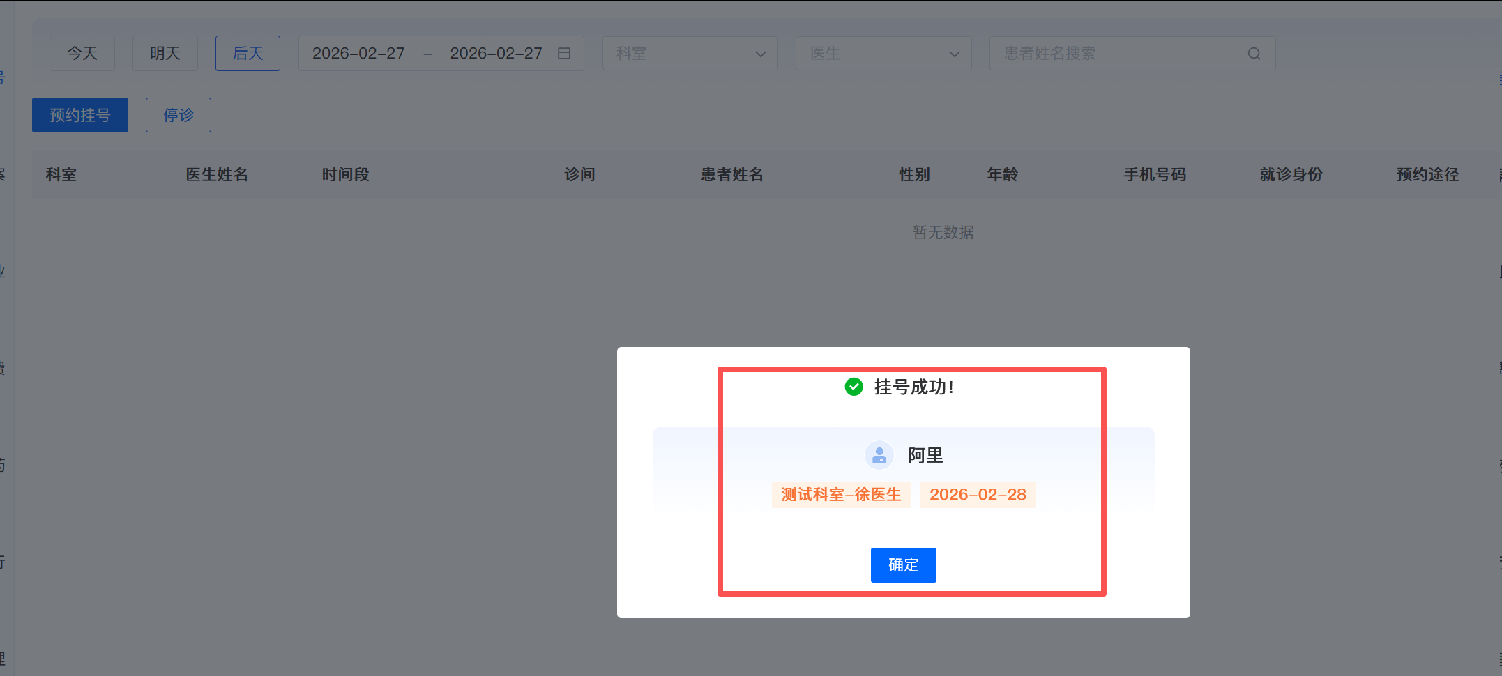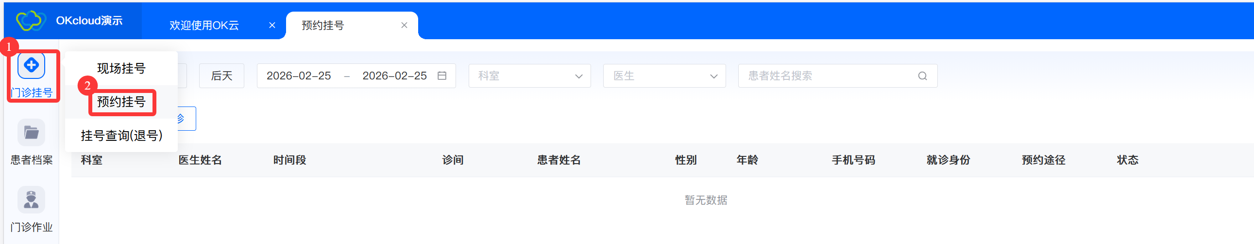 1.登录系统后,点击【门诊挂号】->【预约挂号】,进入预约挂号详情页。