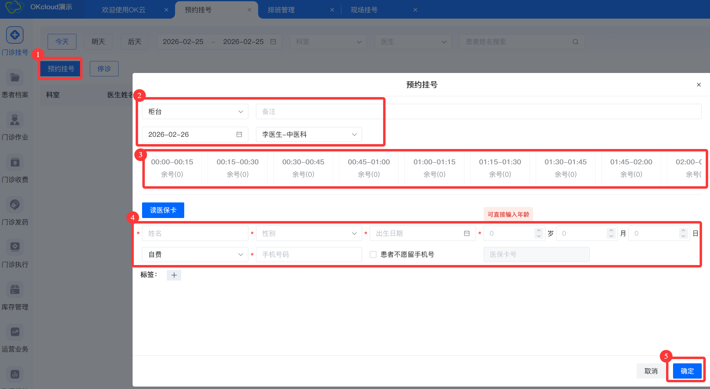 2.选择预约挂号方式为“柜台”、“网络”等,选择日期、医生后,选择可预约时间段,点击后弹出“预约挂号”对话框,录入患者信息确认后即可预约成功。支持读取医保卡信息填写信息
