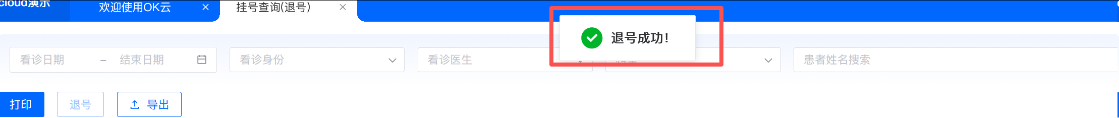 2.搜索需要退号的患者姓名,选中挂号记录,点击“退号”,弹框提示患者退号信息,只能退“待诊”状态的患者挂号信息,已看诊的无法进行退号。