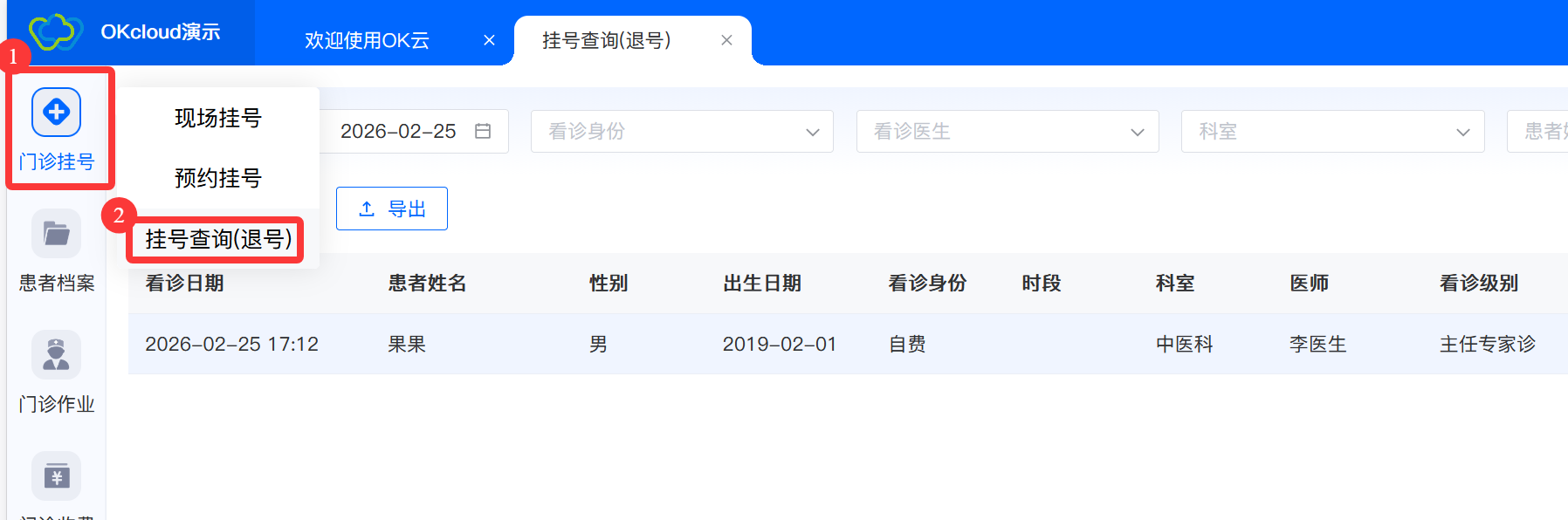 1.登录系统后,点击【门诊挂号】->【挂号查询(退号)】,进入已挂号信息列表页。