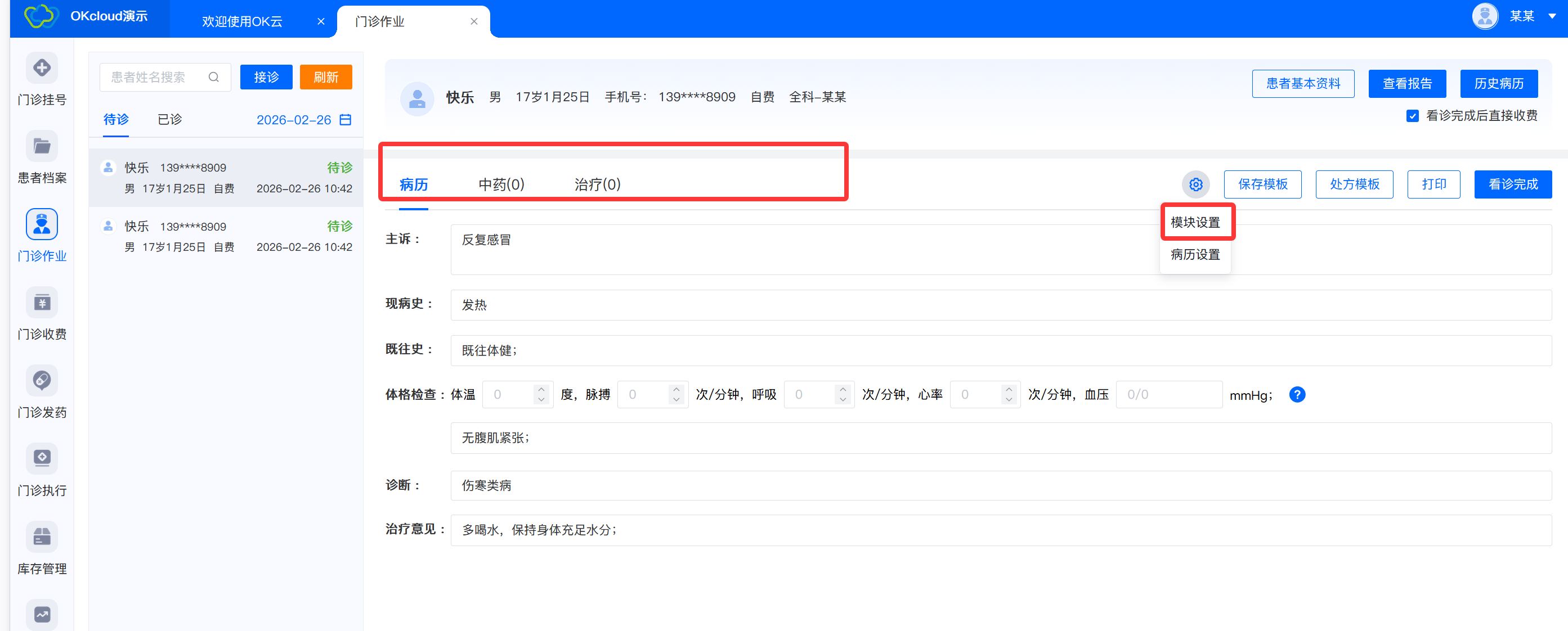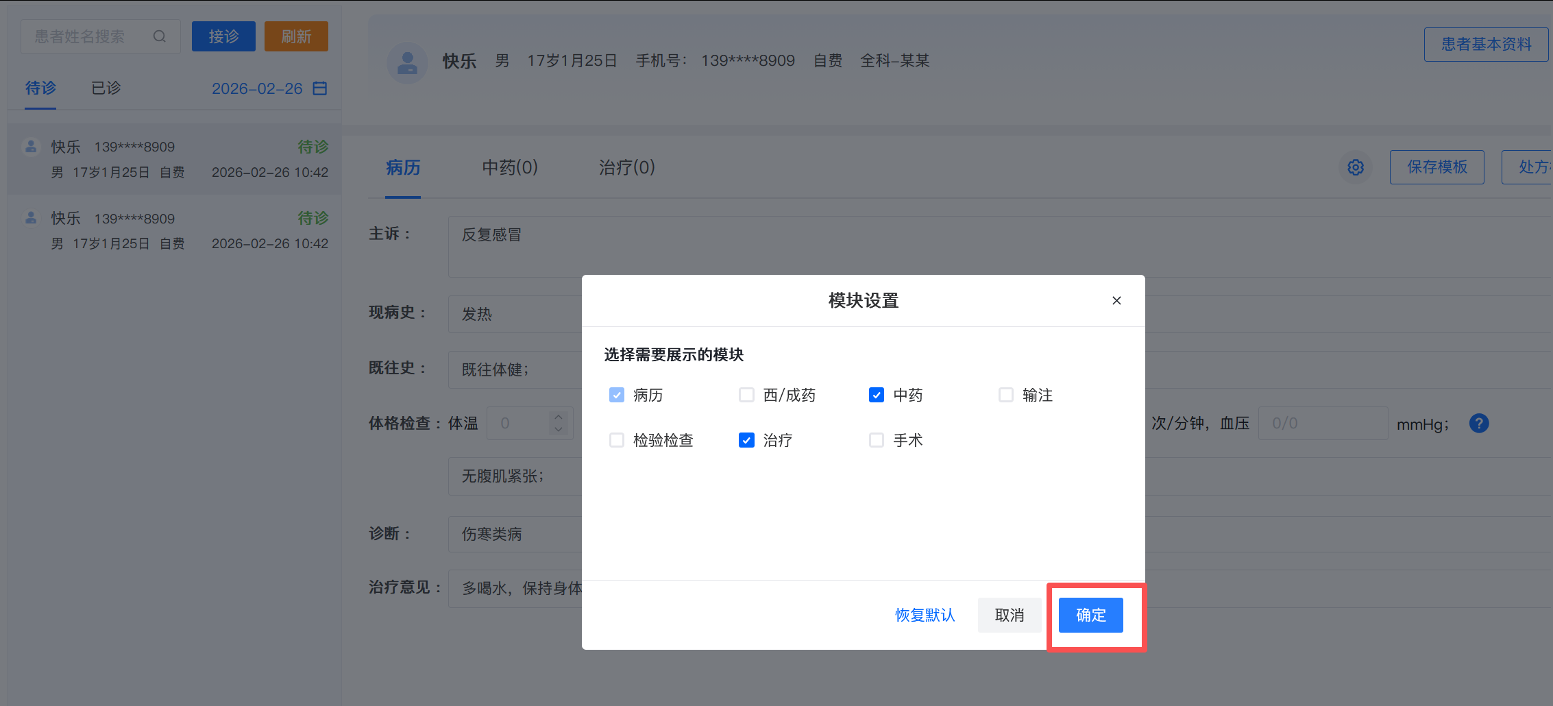 3.点击【模块设置】,支持医生设置页面所需模块,勾选哪些模块,页面就会显示哪几个模块,如勾选了“病历”、“中药”、“治疗”,则页面只会展示这三个模块。