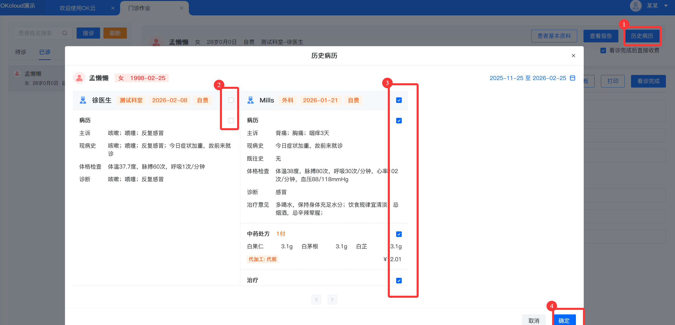 2.点击【历史病历】,如果曾经就过诊,可以查看到当前患者的历史病历信息。勾选历史病历信息,点击确认成功后,可将历史病历信息填入当前病历对应的信息中。病历中含上传的附件,支持双击查看。初次就诊的病历信息为空。