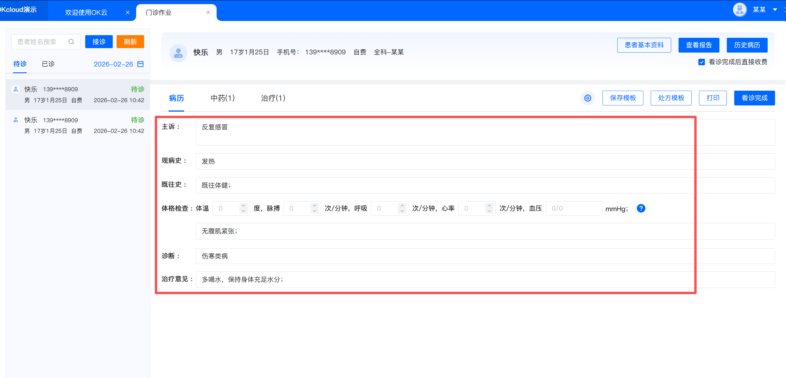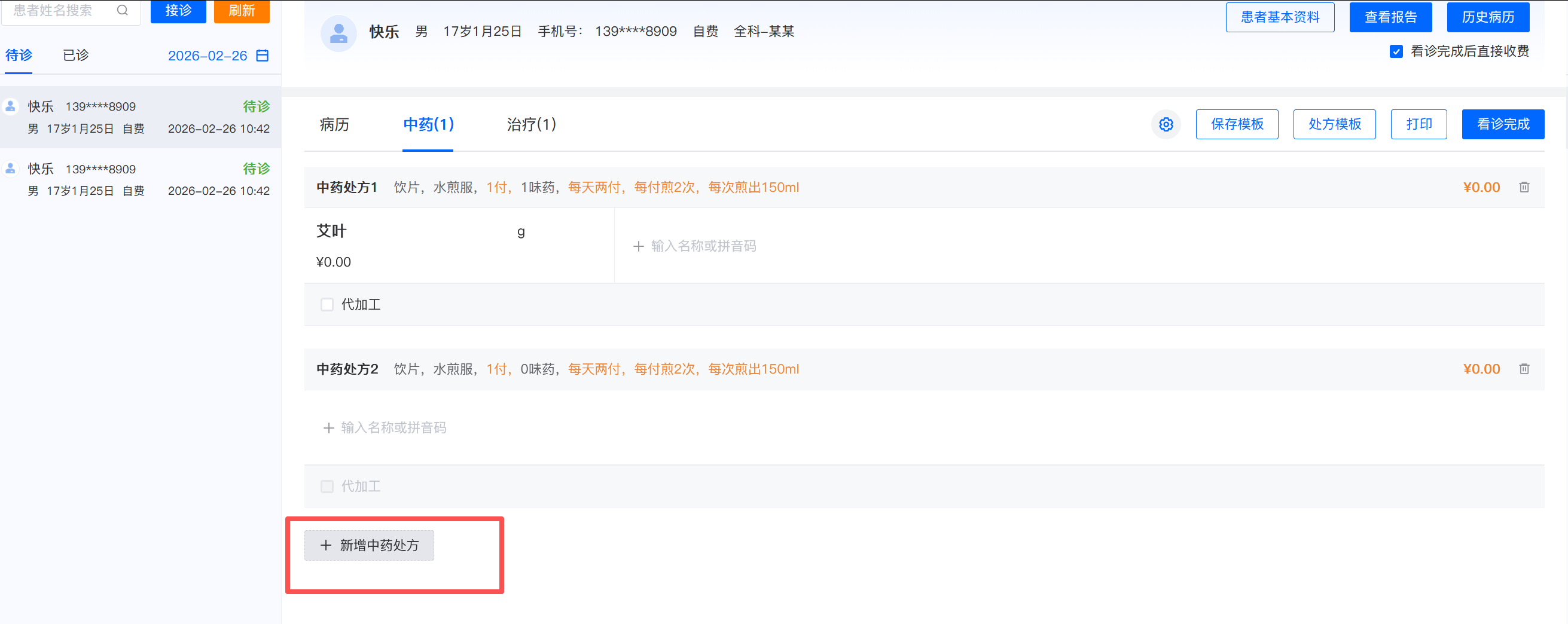 8.病历、中药、治疗等模块的内容都填写完成后,点击【看诊完成】。