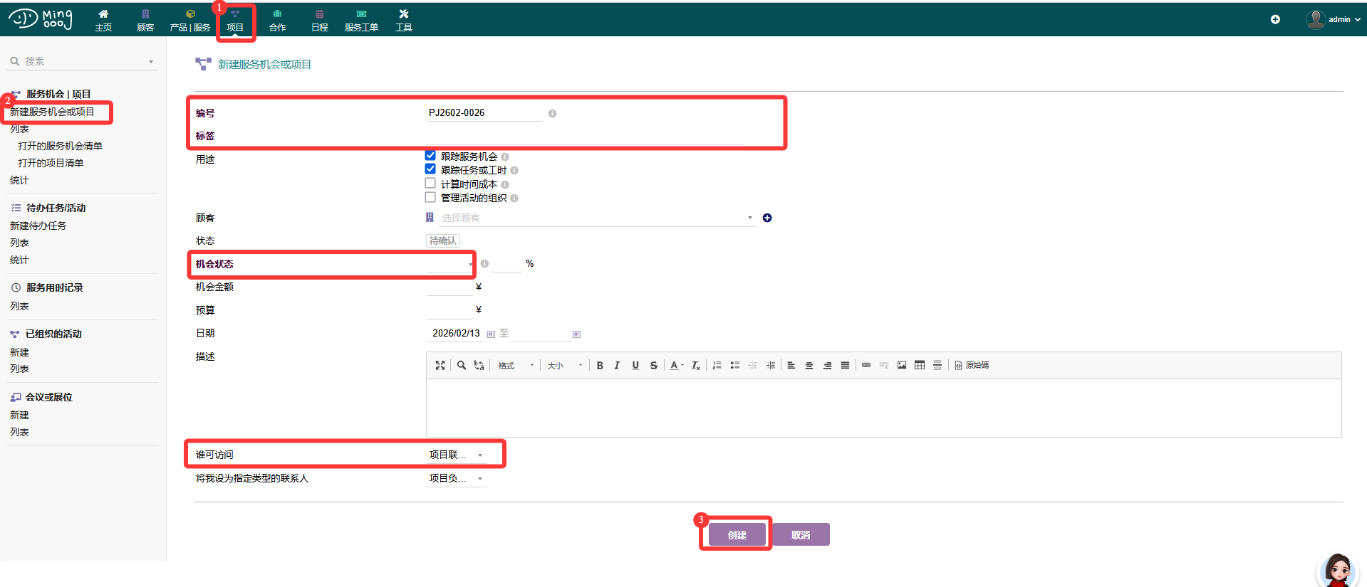 1.进入PCM界面,点击【项目】->【创建服务机会或项目】,填写机会信息,点击【创建】