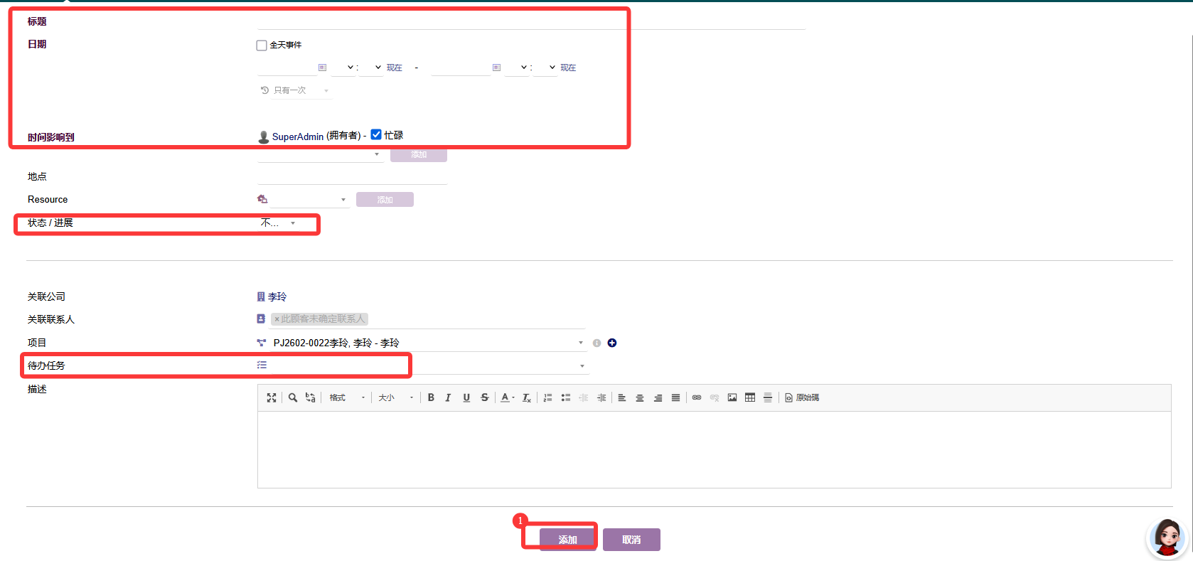 标题:事件名称。分别创建两个事件,标题分别为预约反馈和等待来电。日期事件计划完成日期,可设定某一天,也可以每周、每月循环。例如有固定周期的复诊可以循环复诊提醒。时间影响到:对应的是事件执行人。状态/进展:: 选择未完成,已设定事件完成日期,但未到时间。待办任务::关联对应的待办任务。选择诊疗效果回访待办