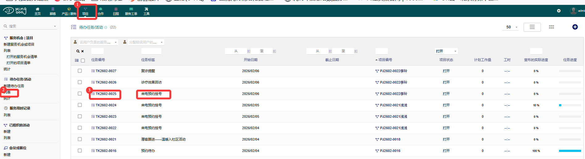 1.进入PCM界面,点击【项目】->【待办任务/活动列表】,来电预约挂号,点击任务编号,进入待办详情