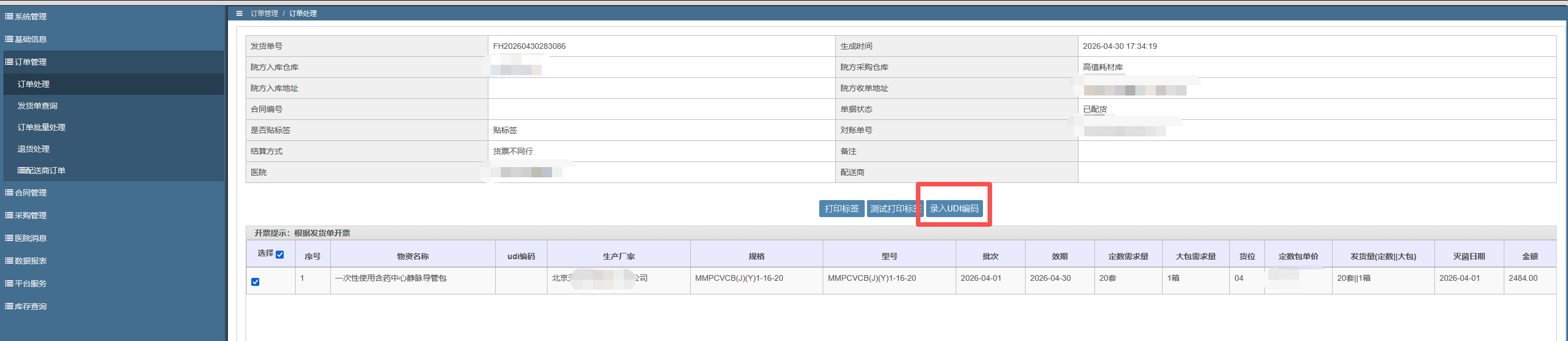 1.订单处理详情 -> 2.生成发货单 -> 3.新增发货物资 -> 4.保存发货物资 -> 5.填写产品信息 -> 6.录入UDI码 -> 7.发货-> 8.打印发货单具体操作