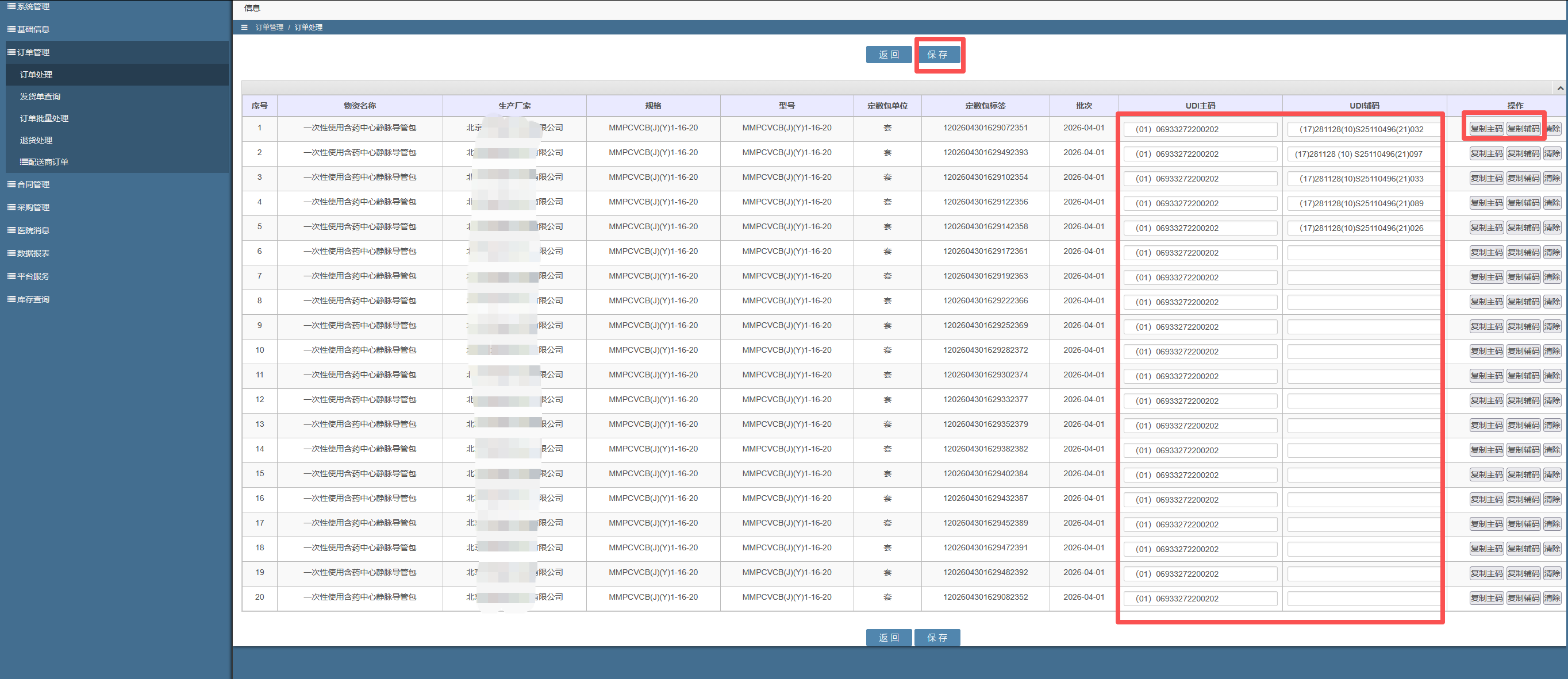 6.点击【录入 UDI 码】进入对应界面,填写物资的 UDI 主码与辅码信息。若同一耗材的 UDI 主码、辅码均一致,可直接点击【复制主码】、【复制辅码】,一键复制;若辅码不相同,则需扫描实物辅码手动录入,不可直接复制,填写完所有耗材的UDI主+辅码后,点击【保存】。如填写错误可以点击【清除】后重新填写。